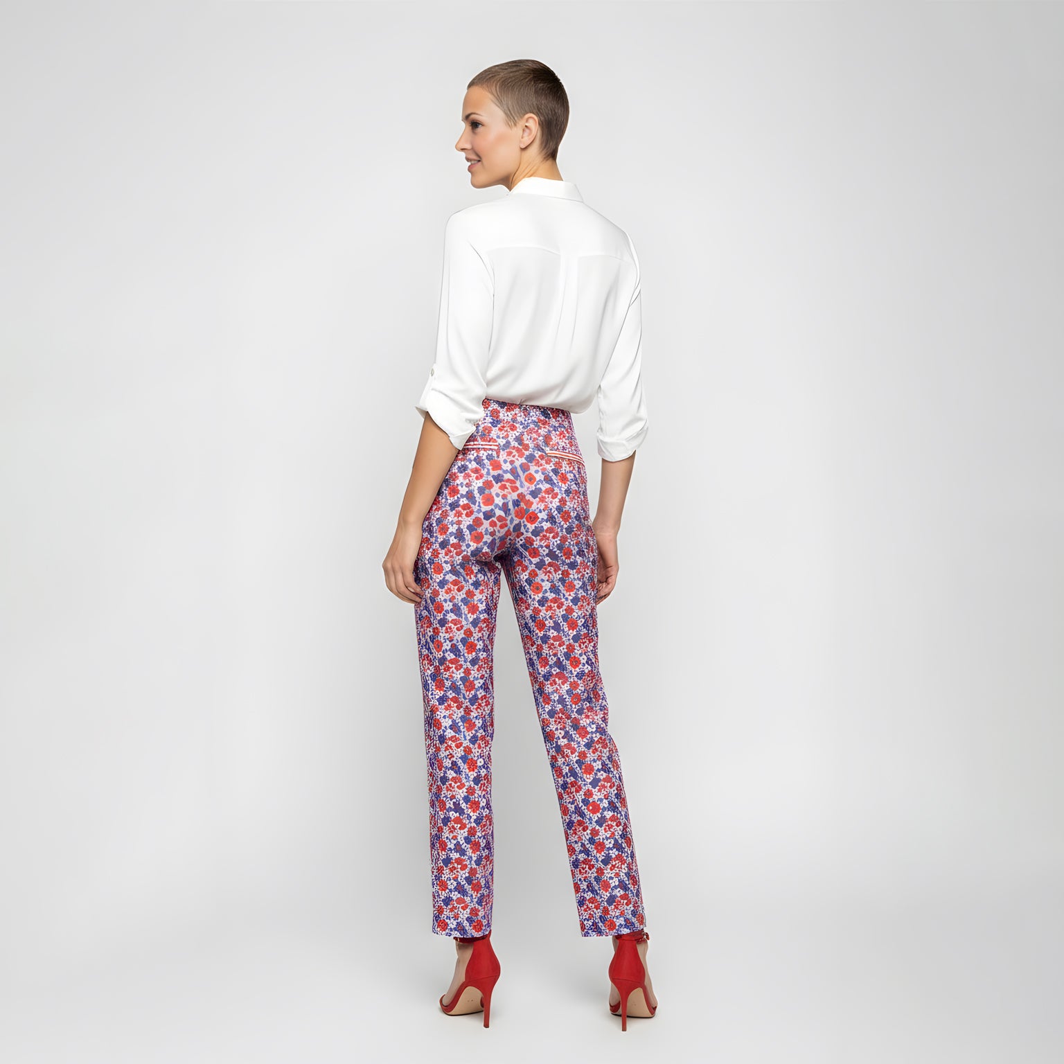 Step out in style with our Women's Tailored Trousers in Blue and Red Floral. This vibrant piece features an all-over petite floral print in hues of rich red, blue, violet, and white, set against a mid-blue base. The high-waisted fit is highlighted by a unique, contrasting waistband adorned with larger multicolored abstract florals for an extra pop. Made from a soft mid cotton Tencel stretch twill, these trousers offer just the right amount of structure and comfortable stretch. Perfect for elevating your everyday look with a playful yet polished touch.